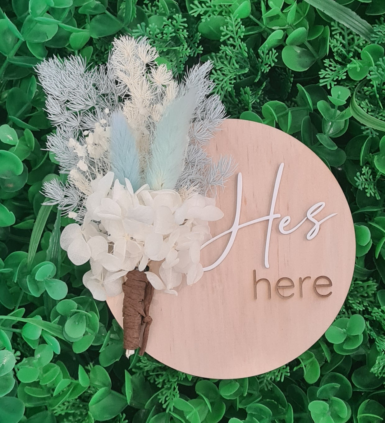 Welcome your little one in style with our 'He's Here' or 'She's Here' plywood disc featuring a charming floral bouquet – Team blue or Team pink!