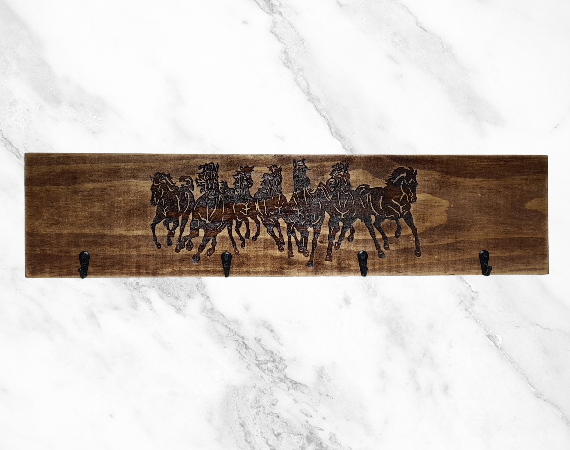 Organise your keys in style with the Timber Keyholder featuring 4 hooks and a stunning engraved design of 7 galloping horses.
